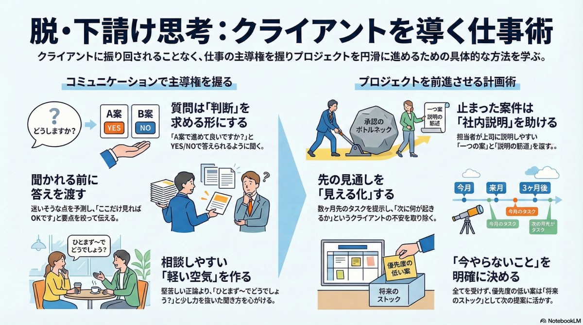 といった状態から抜け出し、自然に主導権を持って仕事を進めるための考え方と実践ポイントをまとめています。主導権は無理に握るものではなく、準備と整理を重ねた結果として生まれるという考えです。